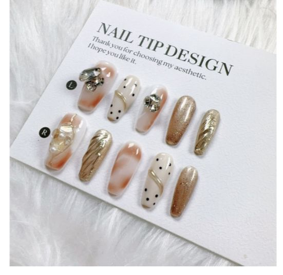 Elegant stick-on nail tips featuring sophisticated neutral tones with artistic accents. This collection includes nude, gold, and white nails decorated with polka dots, delicate florals, and metallic foil details. Each set provides salon-quality manicure results without the time or expense of professional application. Easy to apply and remove, these durable press-on nails offer instant glamour for special occasions or everyday elegance.