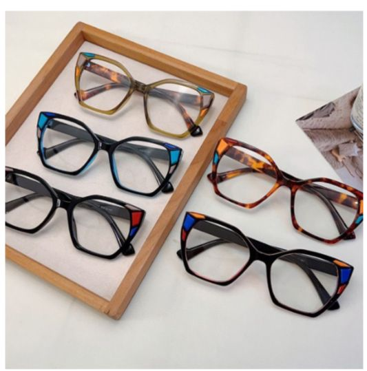 Stylish oversized eyeglasses featuring clear lenses with colorful accent details on the temples. This collection includes various tortoiseshell patterns and bold colors like blue, red, and amber accents. Perfect for both prescription lenses and blue light protection, these frames offer a fashionable retro-chic look while providing eye comfort during screen time. The lightweight design and comfortable fit make them ideal for all-day wear.